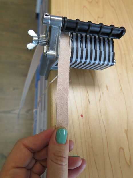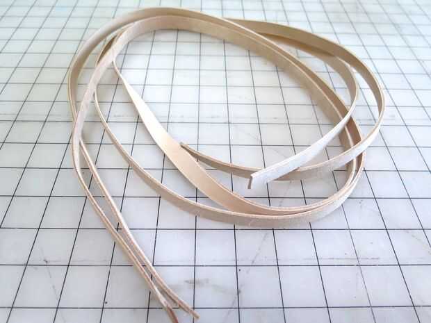 Mientras se secaba mi cola he creado las correas extendidas que va a subir la pierna. Usa cortador de la correa de Tandy para obtener 4 correas que fueron un incluso 1/2" ancho 45" de largo, pero también podría hacerlo con un cuchillo del exacto y podía ordenar correas de corte 1/2".