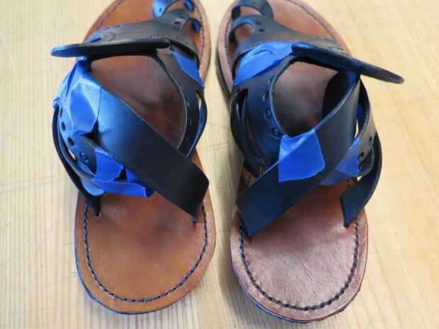 Antes de usar la herramienta, me aseguré que todos mi correa suelto termina dentro de la sandalia para no quedar atrapados en la lijadora de cinta. Usé cinta de enmascarar que no deja marcas o dañar el acabado de las cintas.