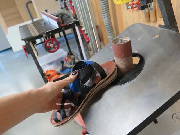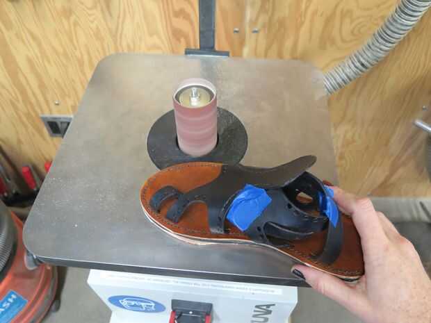 Luego usé la lijadora de disco para todas las áreas del borde del talón que tenían curvas convexas, como el dedo del pie de la sandalia y la parte del talón. Me cambié a la lijadora de husillo a la arena de los arcos. Inclinación de la cama de la lijadora de husillo me permitió a la arena el ángulo de la espalda y los lados del talón.