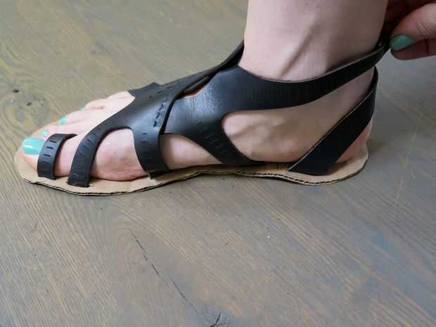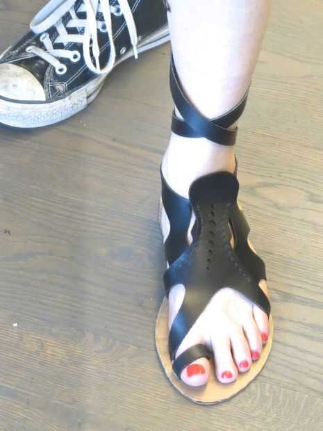 Para crear una forma de pulpo la para la parte superior de mi sandalia, empecé mirando mi bosquejo y dibujo la forma de un pulpo en un papel que parecía del tamaño justo para ir alrededor de mi pie. Me cortó de esta forma y envuelto alrededor de mi pie para comprobar su ajuste. Tomó bastantes revisiones para llegar a la forma correcta y después de varias iteraciones en papel me pasé a la tela y finalmente montar cuero de chatarra para obtener una más precisa.