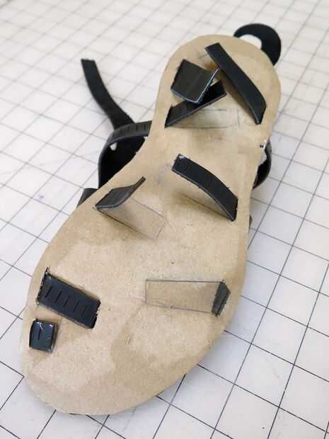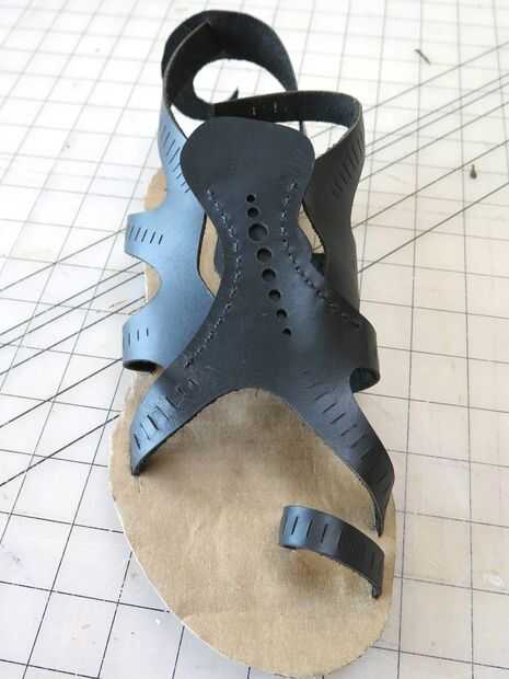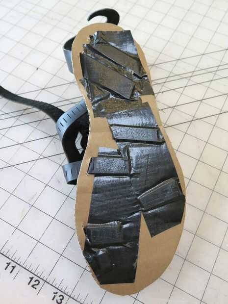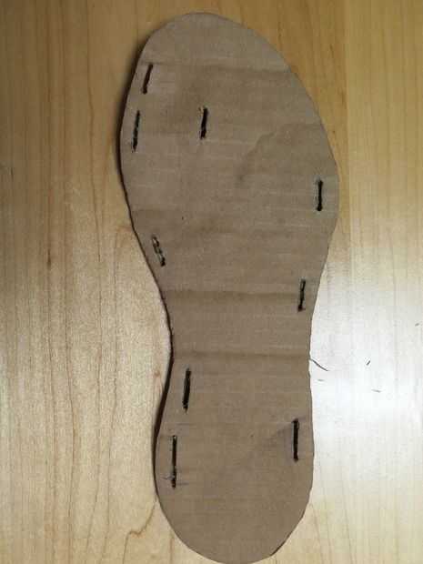 Entonces usé una lezna del rasguño de las correas para marcar donde cada uno resolvió la única. Me entregaron mi maqueta de zapato, quitado la cinta y remontar alrededor de los extremos de cada tira. Esto me dijo donde el corte de cinta del patrón salidas en mi suela.