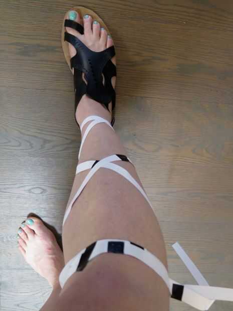 Yo corte dos 48" largo 1/2" ancho tiras de papel y había pegado a los extremos de las correas del tobillo de cuero. Luego ató encima de mi pierna para ver cuánto tienen que ser. Quería llegar hasta encima de mi pantorrilla por lo que quedaría hacia arriba. Me había enrollado dos veces alrededor de mi pierna en la parte superior y había marcado donde se reunieron.
