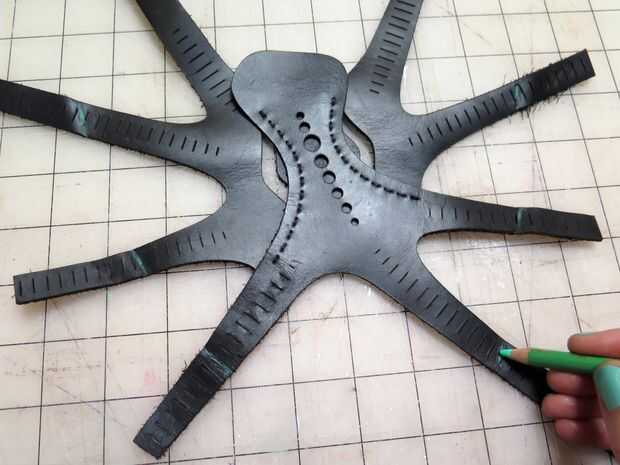 Cuando estaba satisfecho con mi diseño, marcada la ubicación de cada correa de 'tentáculos' de la planta y luego cortar ranuras en mi patrón de cartulina para las correas a través de la alimentación.