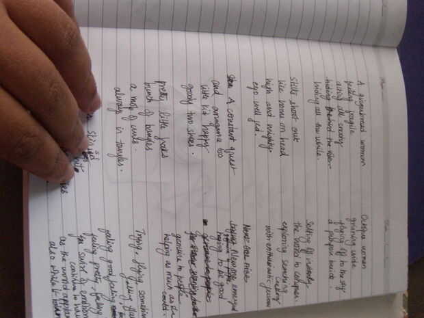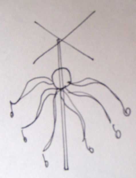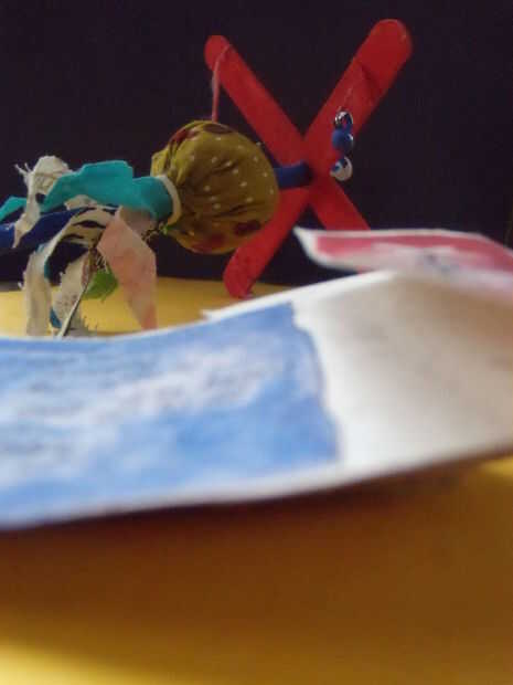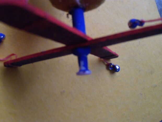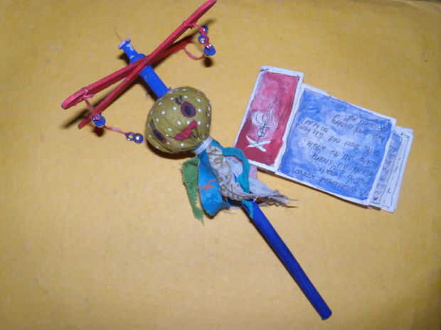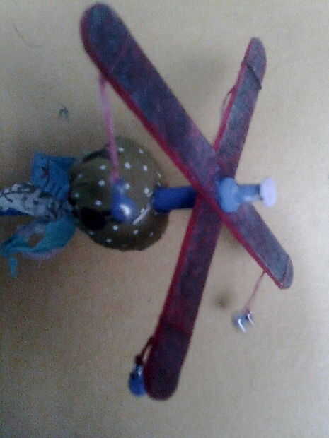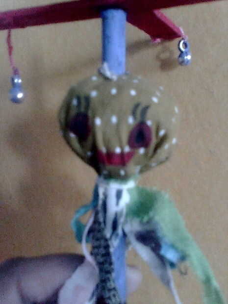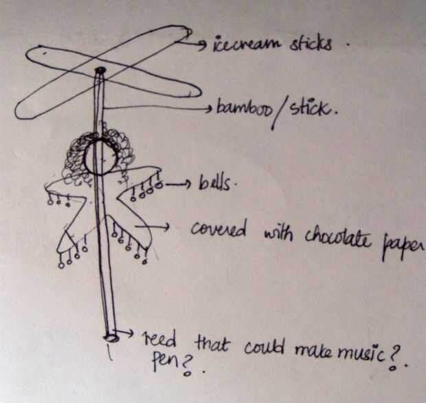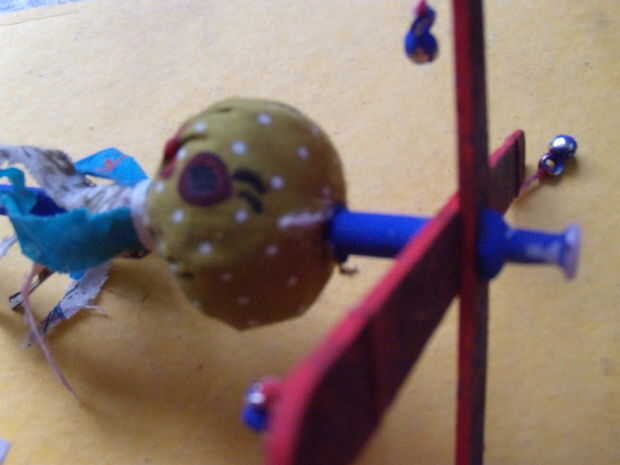 Formé el OO fuera una rama de bambú delgada sobre la cual estaba encadenado un pulpo de tela. La rama de bambú se asemejó a zancos y fue señalando el hecho de que nunca tuve mis pies en el suelo. Para representar mi actitud frívola, hice cuatro palas del rotor por cruzar dos palos de helado en el centro y mantenerlas en su lugar con un tablero de tachuela. Estas hojas, me pegué al pulpo de la rama de bambú con el pegamento. Encadenan ghungroos(bells) poco en las puntas de las palas del rotor para proporcionar un sonido cada vez utiliza una excavación en mi naturaleza habladora.