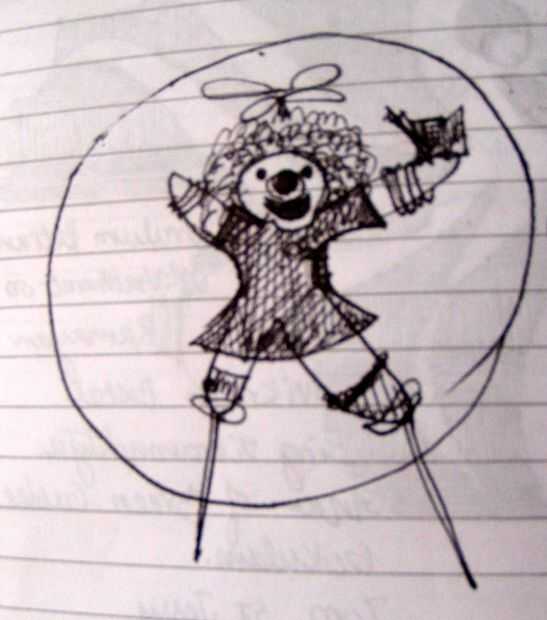 Como mis garabatos original dio a luz una mujer de pan de jengibre, he decidido explicar mi juguete en forma de un acto. Cubrí mi juguete con otro trozo de tela y como sentido huelgas de lo OO, se despoja de su piel tela y emerge para volar en el cielo.