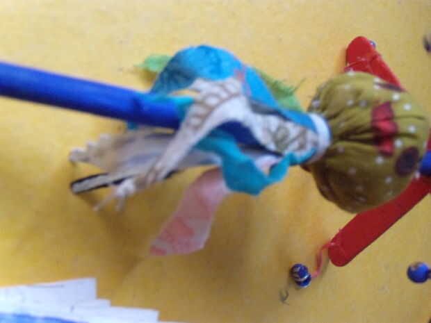 Utilicé colores primarios brillantes para pintar OO, para atraer a los niños. El palo, tachuela y ghungroos fueron pintados de color azul brillante, las láminas de rotor se cartel color rojo y tenían algunos patrones intrincados de la trama en su parte superior. La cabeza del pulpo era un verde musgo con topos blancos y había pintado una feliz expresión. Las manos se hicieron de corte tela multicolor. Una pequeña banda blanca llevó a cabo la cabeza y el cuerpo juntos.
