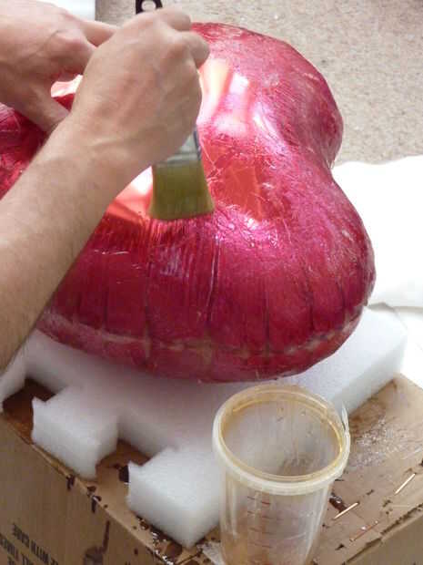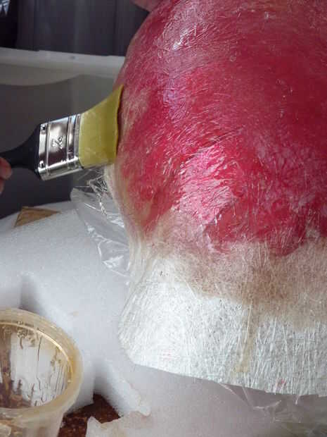 La resina ablanda la pintura color rojo en la superficie de los globos, pero no ataca el plástico metalizado por debajo por lo que el globo permanece inflado. Claramente debe tener cuidado de no pinchar hasta que una capa de la estera se ha aplicado a cada lado, aunque es bastante robusto.