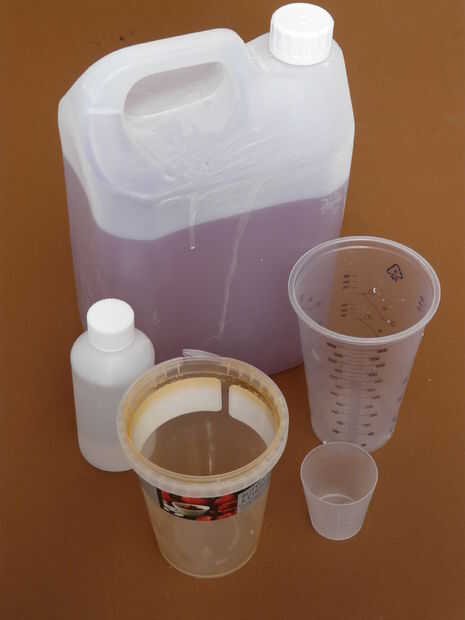 La resina y el catalizador deben ser mezclados en la proporción de 100: 2 por lo que para un volumen dado de resina se añade 2 al 5% de catalizador. Cuanto mayor sea la concentración de catalizador el ayuno cura la resina. Usé 1% catalizador inicialmente para las primeras capas, esto me dio unos 30 minutos para aplicar la resina a la estera. Cada capa necesita aproximadamente 200ml de resina.
