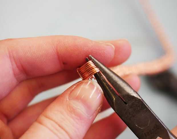 Para completar los extremos, tomar su aguja alicates y doblar los cables extras. Para ello, crear un pequeño círculo o un óvalo con los cables extras y presione suavemente en el extremo de su armadura. Idealmente, estos cables cubrirá el interior de su envoltura final, por lo que cualquier extremos afilados estén metidos a bonita y segura.