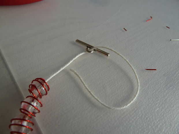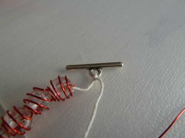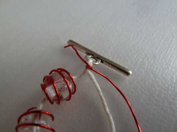Cuando haya agregado todos los granos, también puede Agregar un cierre. Nudo dos veces para fijarla un poco y un pice de alambre alrededor de la bobina. Después de enrollar el alambre, corte el hilo restante. Repita esto para la otra parte del cierre.