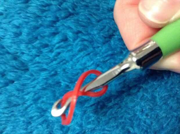 Tomar una banda que coincide con el arco y gire una vez en el gancho, luego páselo a través de sus bandas para crear un nudo del resbalón.