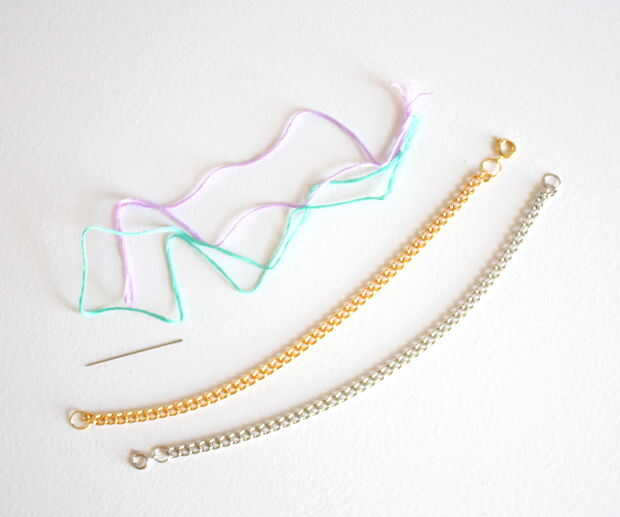 Recuerdo que hace como un niño, y honestamente, son igual de divertidas para hacer ahora! Puede usar como pulseras o collares, o incluso utilizar este mismo método para hacer abrigos de pelo.Recoged los suministros.Se necesita hilo de bordado en dife