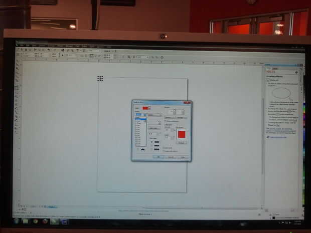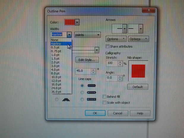 Foto 1-CorelDraw-la vertical barra de la izquierda te da varias opciones de tipo de línea, y si haces doble clic en el cuadrado coloreado en la esquina inferior derecha un cuadro de diálogo aparecerá que le permite seleccionar un color y la línea peso.