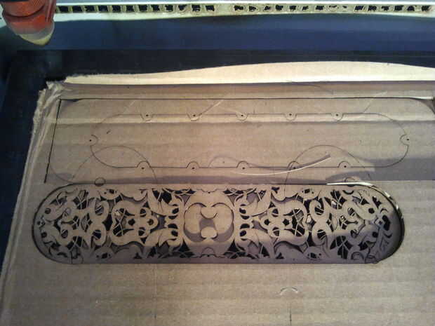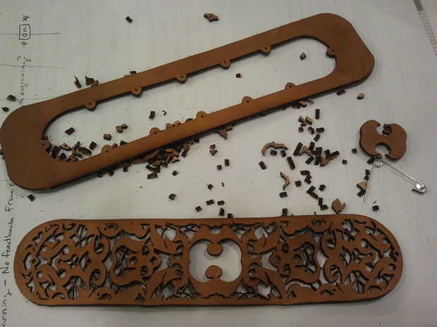 La primera vez no corte a través de todo el camino así que aumentó el poder y redujo la velocidad. La segunda vez penetraba como un campeón. También quería comprobar una muestra de la filigrana para asegurarse de que estos ajustes trabajaría para él también. La mayoría de las piezas salieron pero una pareja colgada allí así que añadido un pase del láser más completo para la configuración.