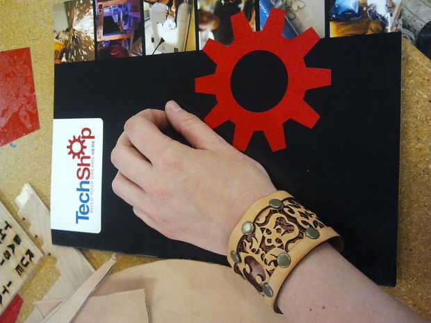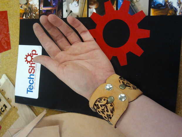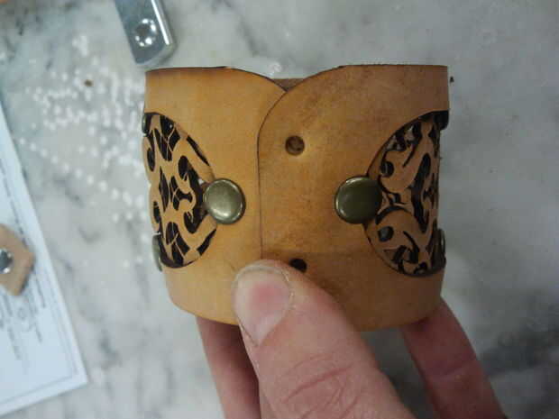 Ya que este brazalete de la curva en un círculo muy apretado es importante trabajar sobre una superficie te puede envolver el borde de la piel alrededor de marcha. El cuero que se usaba era grueso suficiente (1/8 de pulgada) eso si clavan lo plano del bajo capa de la hebilla cuando se puso el brazalete.
