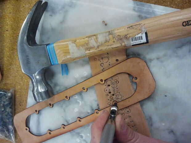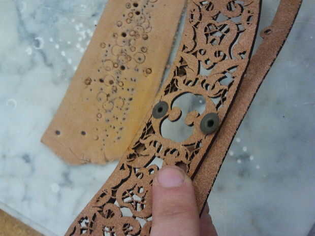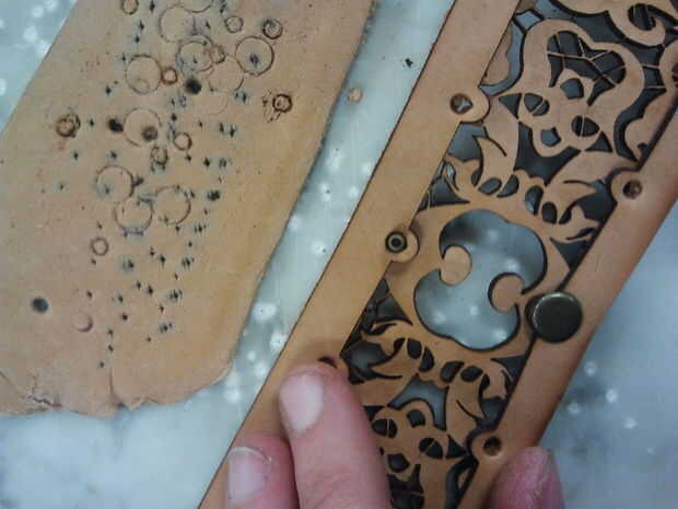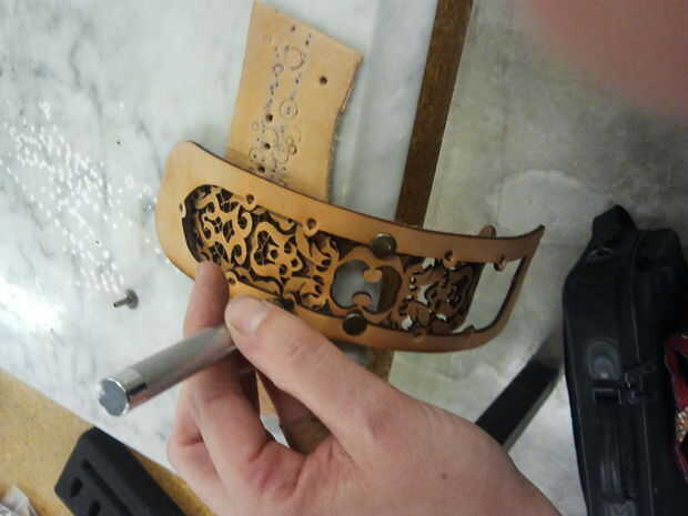 Primero se amplió los agujeros en la capa externa con un golpe a mi remaches. Yo habría podido también hacer estos agujeros más grandes en la fase de diseño y tenía del cuidado de este. Yo no he puesto ningún agujero en la filigrana porque quería juzgar su espacio como que curva el material en esta fase.