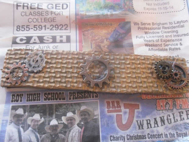 Luego pegué los engranajes en la pulsera con el pegamento caliente (si los engranajes vienen obras de pegamento krazy también).