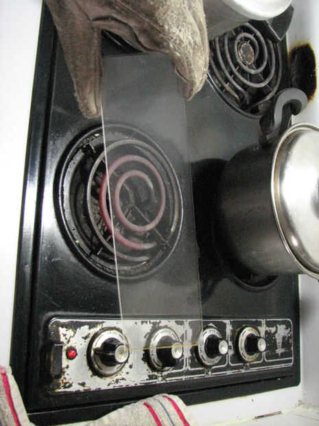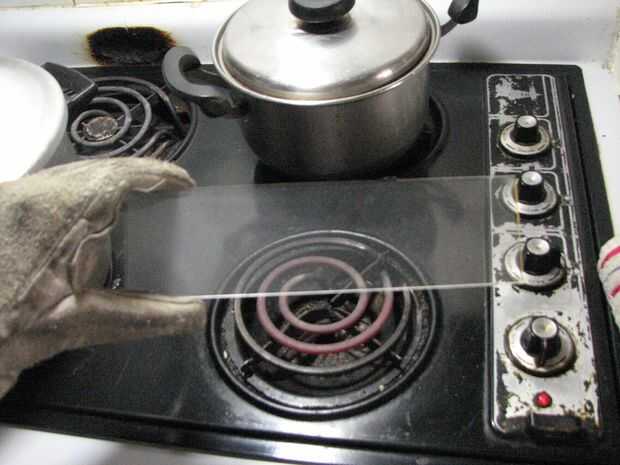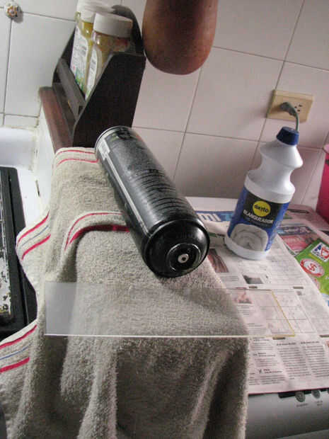Para doblar la hoja a un cilindro ponerlo sobre una estufa eléctrica en alta y con mis manos dentro de guantes de cuero grueso, lo sostuvo esperar suave y enróllelo alrededor de un tubo o cilindro (utilicé una antigua pintura en aerosol puede, algo que nunca debes hacer!, drenó todo el gas y perforar un agujero en la lata para que no estallaría cuando se calienta. POR FAVOR, NO! I, y fue no descuidado pero no significa que no fue peligroso!), poner la cara de la hoja que no es grabada hacia la estufa. Después de hacer esto de que me di cuenta que el plástico tenía un blanco Mancha en ella de lado, así que no lo deje impasible sobre la estufa o esto va a pasar todo. He inspeccionado la forma y vio que algo estaba alterado así que coloque el cilindro sobre la lata de pintura y usa una pistola de calor para corregir la forma.