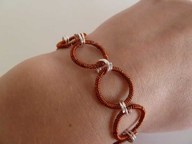 esto es un regalo que hice para un intercambio de regalos de Navidad. Yo quería hacer algo un poco diferente de lo que generalmente hago, probar algunas técnicas nuevas. Había utilizado que arrolla antes, pero sólo para terminar el cable, no para hacer una forma completa. A pesar de que cuesta algo de tiempo para los círculos de la bobina, creo que esto merece la pena. Esto probablemente no es la mejor idea para un regalo de última hora, pero si tienes el tiempo seguramente podría hacer esto. ¿Uso de colores diferentes puede dar la pulsera completa desde otra perspectiva, así que usted puede realmente darle su propio giro, quizás incluso agregar algunos granos? Estoy muy contento con cómo resultó y espero que les guste!