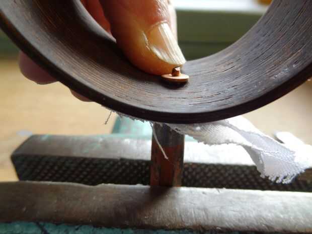 6 Ponga la cabeza del remache en la herramienta en el yunque. Coloqué un trozo de tela delgada entre la herramienta y el remache para evitar marcas en la placa de cobre.