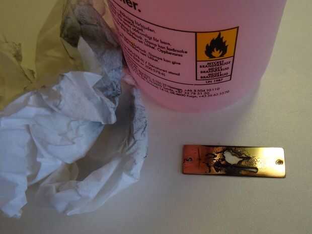 Pula las placas de cobre con una rueda de tela y pulir compuesto, para deshacerse de los arañazos y para obtener una superficie brillante. He utilizado una máquina que pulimenta (lo siento no sé el nombre en inglés), pero también se puede utilizar la Dremel. Gafas de seguridad y utilice pinzas cuando se utiliza una máquina que pulimenta. Si es necesario limpiar con alcohol o un plato con agua caliente y jabón.