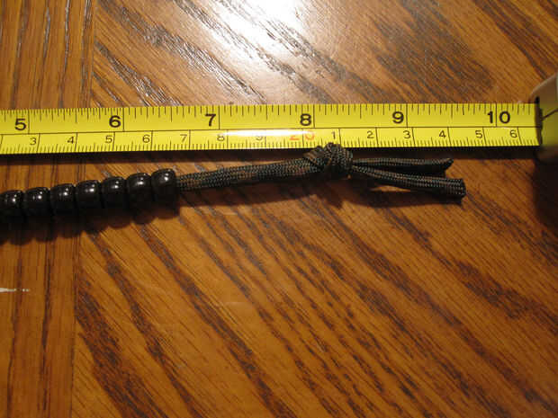 Ahora, ritmo contador cuentas son unos 9.5" de largo por lo que, desde el paracord se dobla, usa unas de 19 pulgadas (o 48,26 cm) de cordaje. Corte mío unos 20"(51 cm) de largo, pero encontré un poco corta al final del proyecto, así que yo sugeriría unos 4 a 5 pulgadas de corte extra paracord para this.bracelet. Este extra se consigue tomado por nudos, etc....