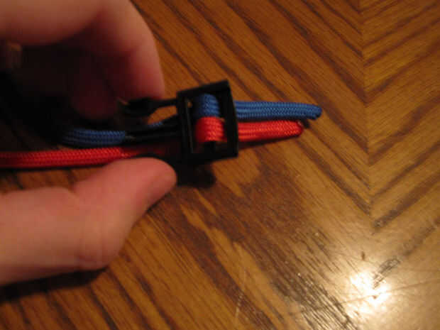 Por lo tanto, me mina había roscado por el orificio trasero primero y luego se tira de ambos extremos hacia abajo a través del lazo frontal, dejándome con 4 hilos. El rojo fuera el filamento va debajo de la base y sobre el azul fuera el filamento, mientras que el azul fuera de filamento es exactamente lo contrario (sobre el núcleo, bajo la roja fuera del filamento). Luego, tire de los extremos apretados y recortarlo.