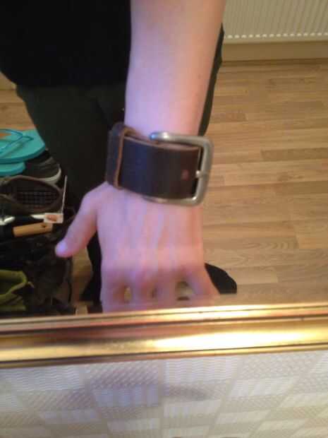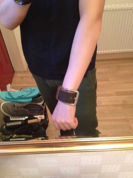 OK esto es una vaina, hecha de un cinturón.Se trata de una correa fuerte que una envoltura resistente.Paso 1: Obtener su material Necesita~ Correa de cuero ancho negro~ Tijeras (utilicé grandes Cizallas)~ Cuchillo (obviamente)Paso 2: Corte de puño Co