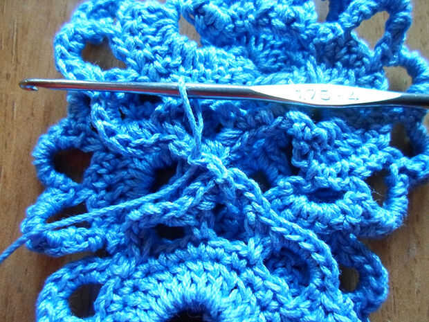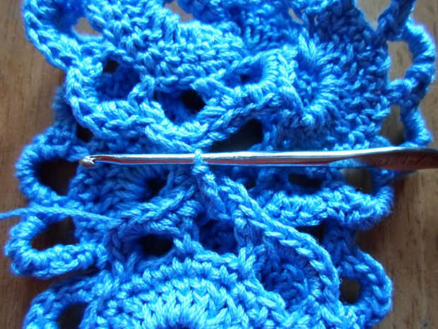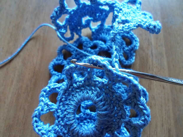 Para ello, hacer sus cadenas para pasar a través de uno de los pétalos de la primera flor y cadena 6.