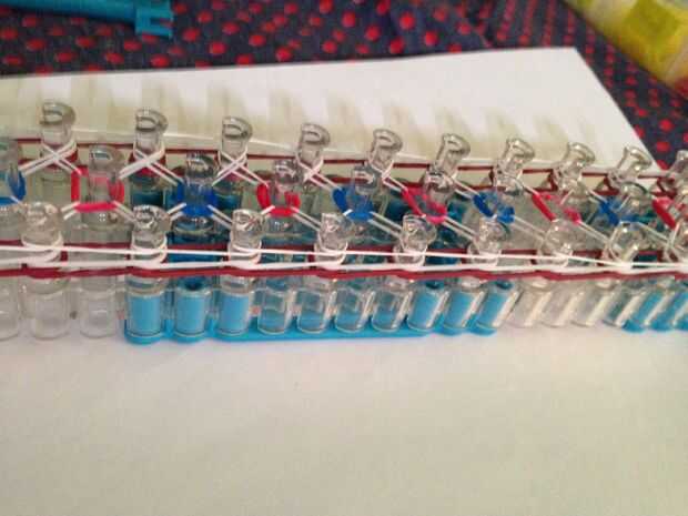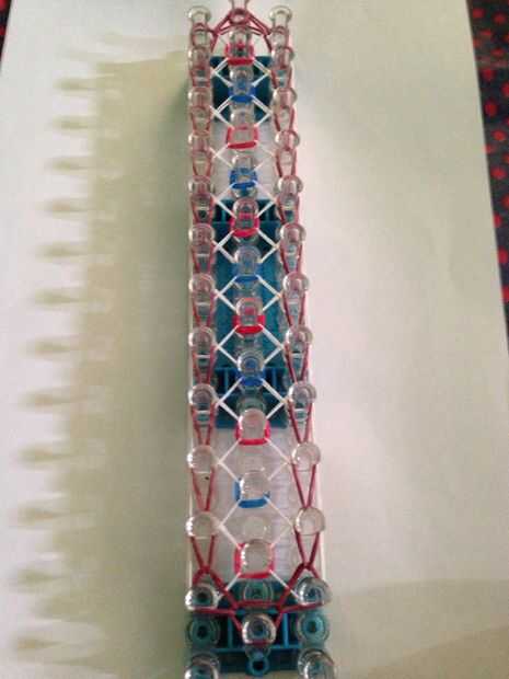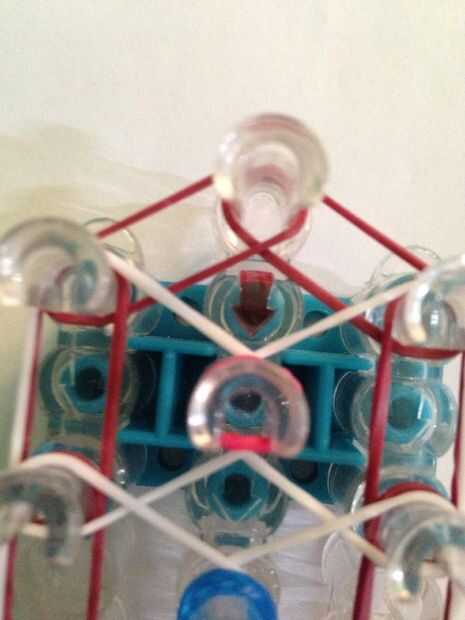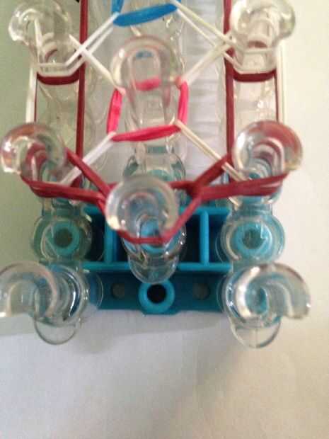 * punta si esta es su primera vez haciendo e intermedio nivel pulsera sugiero usar los mismos colores.Primero consigues una banda de caucho (verde) va en la clavija media y poner diagonalmente hacia arriba a la izquierda y luego de la misma a la dere