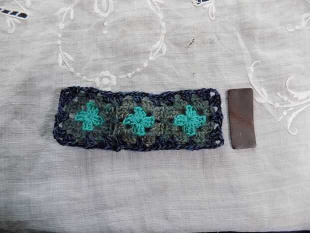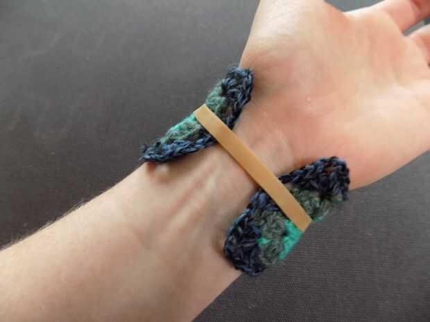El ancho está determinado por su muñeca. Envuelva el brazalete alrededor de su muñeca y hacerse una idea general de qué tan amplia es la brecha entre los extremos. Usé una banda elástica para sostener la imagen. Esto puede ser útil si desea obtener una medida precisa, pero recuerda que la pulsera se estirará.