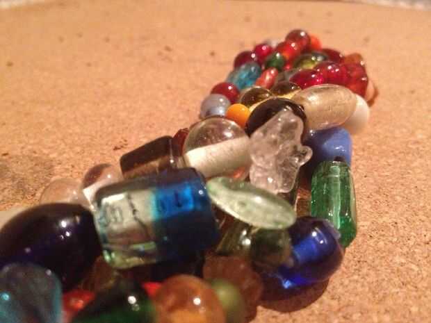 Hacer satén precioso o joya tono cuentas de antiguos vasos de plástico, botellas de refresco de plástico y jarras de leche - apenas sobre cualquier cosa fina suficiente para corte y plegado de la curva. Combiné los granos plásticos que hice con vidri