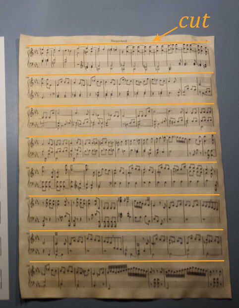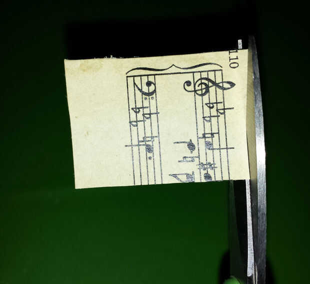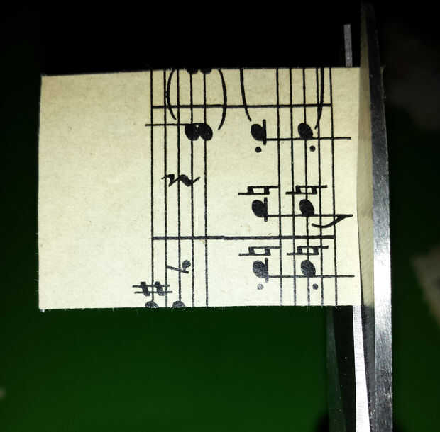 3. Cortar la página de música de la hoja en tiras separando las líneas de la música. Corte cerca de la parte superior de cada línea como sea posible sin cortar cualquier nota o símbolos. (ver foto)
