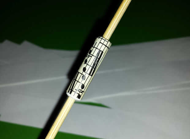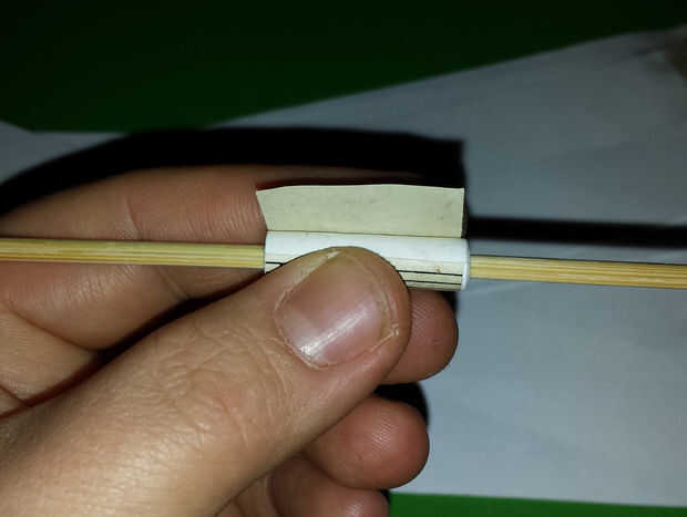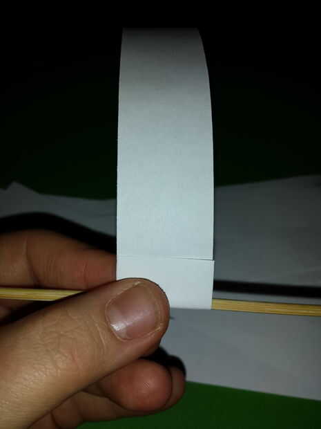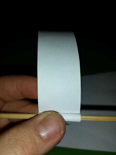 1. Con el estampado en su frente tira hacia abajo y hacia delante, doblar el extremo del papel blanco normal de una tira alrededor de un pincho. (ver imagen)