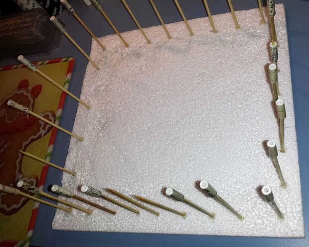 Para hacer un rack para rociar sus granos, pulse la tecla pinchos en la pieza de espuma de poliestireno todo el camino alrededor de los bordes con el lado puntiagudo. (ver foto)