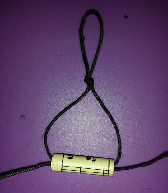 Enrosque un extremo de su cable a través de una línea de derecha a izquierda. Enrosque el otro extremo a través de la misma cuenta de izquierda a derecha. (ver foto)