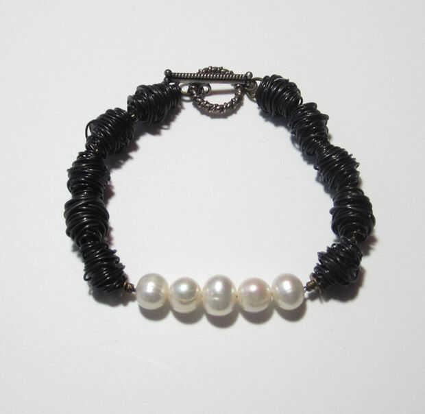 Aquí está una variación de la pulsera de abalorios de Tornado que quería compartir con ustedes... Perlas de acero acompañada de hermosas perlas de color blanco, cerradas con un cierre de palanca de plata. En esta versión las perlas son engarzadas en alambre de abalorios, y los granos de Tornado se encadenan en la cadena de abalorios. Continuaré registrar las variaciones en este diseño en la semana que viene.