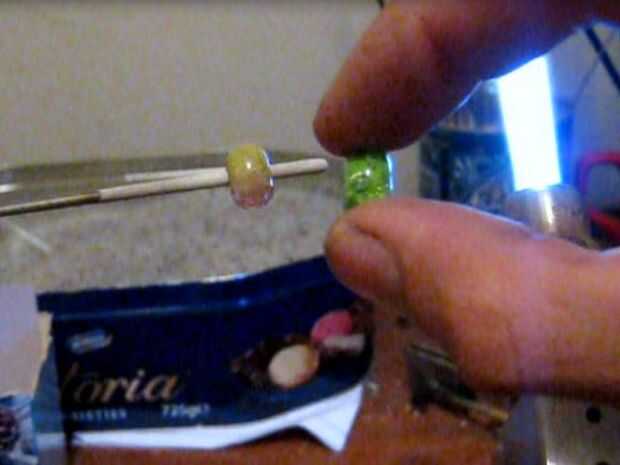 Mis cuentas de burbuja de aplicar un color base de vidrio opaco, calentar el grano entero a brillar intensamente y tan pronto como el brillo se desvanece, enróllelo en el bicarbonato de sodio. Se enfríe rápidamente, así que mantenerlo caliente en el final de la llama mientras que calentando un vidrio transparente en la base de la llama. Una vez que tengas un buen recojo del vidrio fundido transparente, aplicar al exterior del grano para encajonar el color opaco. Tan pronto como usted pone en, usted verá las burbujas empiezan a formar desde el bicarbonato de sodio. Calentar el vidrio transparente para que el grano bueno y simétrica (no como mis granos), pero no calienta lo demasiado, y las burbujas se estalló y los dejo con cráteres. Tarda algunos jugando con a hacerlo bien.