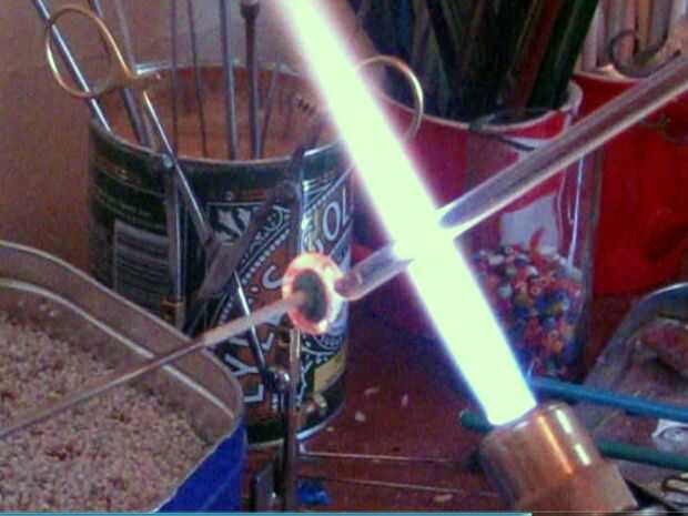Para hacer una tira: sostenga el mandril revestido con una mano en 90° a la llama y caliéntelo lentamente mientras también Precaliente el vaso con la otra mano. El mandril debe ser lo suficientemente caliente como para el vidrio caliente se adhiera a él, pero no tiene por qué ser brillante. Precaliente el vidrio muy lentamente y con cuidado al principio, demasiado rápido hará que un choque térmico, explosión de fragmentos de vidrio por todas partes.