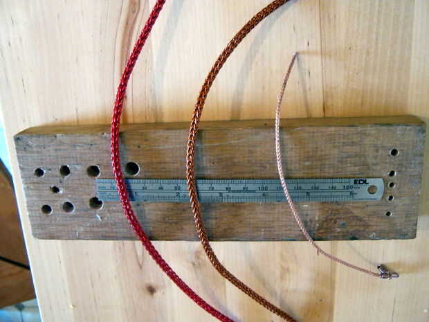 Para obtener la cadena de tamaño adecuado para el tamaño de los agujeros del grano, debe utilizar el mismo mandril para el viking knit como solían hacer las cuentas con. La forma en que funciona es: el alambre se coloca a través de sí mismo y enrollado alrededor del mandril. Una vez tengas suficiente cadena tejida, puede retirar el mandril y dibuja la cadena a través de una serie decreciente de agujeros. Para obtener la cadena suficientemente pequeña para caber en los agujeros 1/8" grano, tuve que iniciar con un agujero de 7/32" y mi forma de trabajo hacia abajo en incrementos de 1/32". Como dibujar progresivamente la cadena a través de los orificios, se disminuyen en diámetro y aumentar en longitud. Es más o menos una proporción de 1:2 de pre-dibujadas longitud posterior dibujado, pero siempre hago un poco extra.