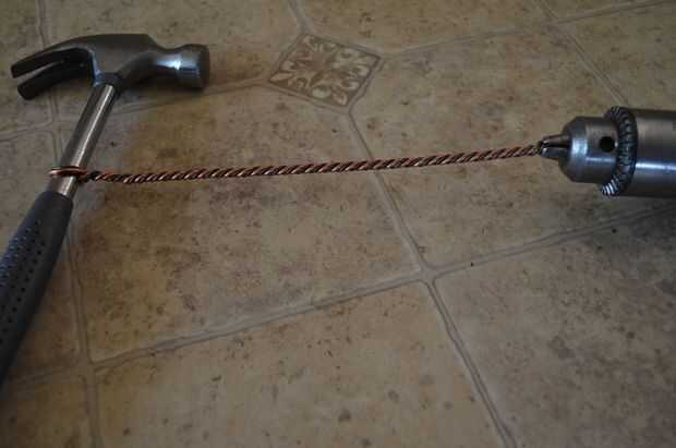 Doblar los cables por la mitad sobre el martillo, pinza en el portabrocas de un taladro de mano y gire mientras está parado sobre el martillo. Ir lento, tienes que un taladro con una llave de mandril por lo que pueden afianzar con abrazadera apretado lo suficiente. Cortar los extremos del lazo de los cables y tire de ella el martillo.