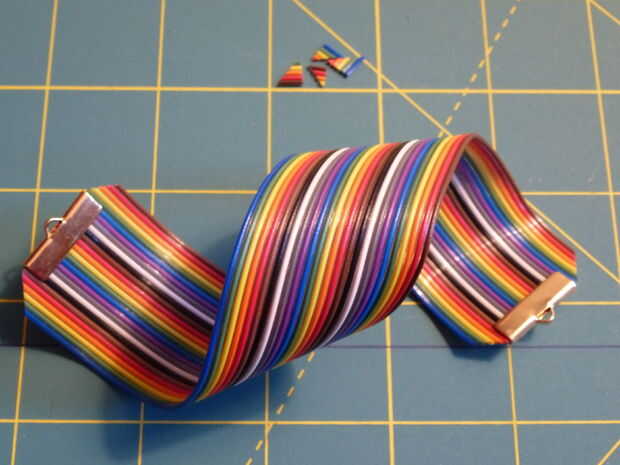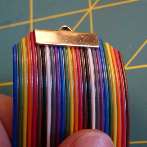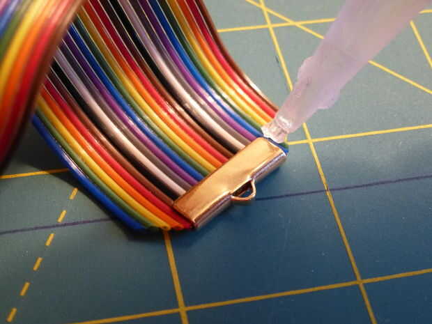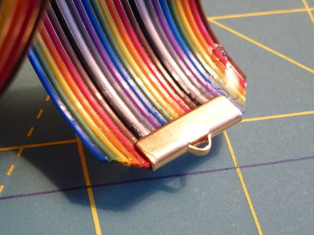 Siguiente, pegamento los extremos en el interior de la pulsera para que no debilite o separe. Alambre de la cinta es fácil de separar. Puedes descomprimirlo en cualquier lugar y hacer dos pulseras más pequeño de un pedazo de ancho. Para nuestros propósitos, una fina capa de pegamento debe ser fineza. Pegamento especialmente las esquinas no crimpadas. Deje que se seque completamente antes de pasar a la siguiente etapa, pegamento le encanta pegarse a la piel (sé, por experiencia, yo casi súper pegado un brazalete para el brazo).