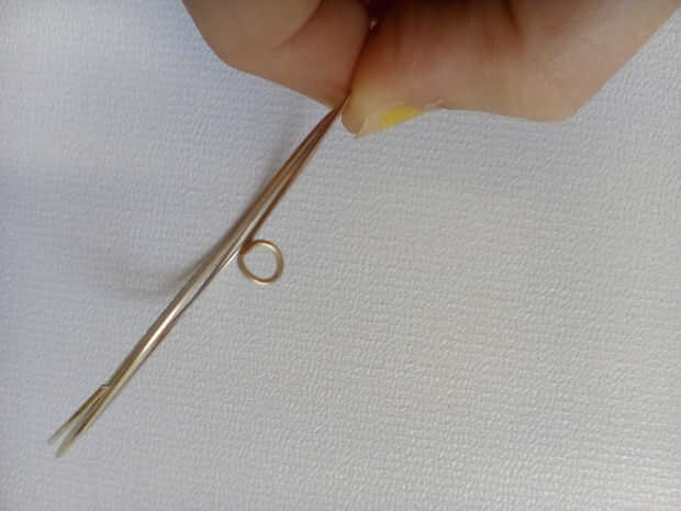 Alambre de la memoria viene en una bobina que corte a la longitud. Con cuchillas laterales, corte una longitud que se enrolla alrededor de su muñeca dos a tres veces. Utilizar los aguja-alicates de punta para crear un bucle ajustado en un extremo. Simplemente Envuelva el extremo del alambre firmemente alrededor de una de las puntas cónicas de los alicates. Tire firmemente para crear el bucle (un adulto tendrá que hacer esto para usted si usted es un niño). Este bucle parará viene de los granos y también tienen el encanto que añadiremos al final.