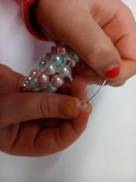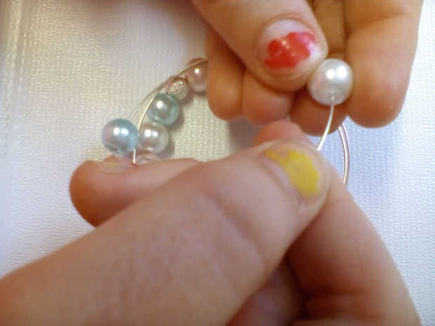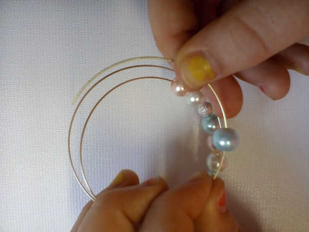 Ensartar cuentas en alambre de memoria es fácil, porque el cable tiene su forma de que los granos permanecerá incluso si te cae. Trate de plan donde tus granos van a ir - muchos del mismo color juntas o demasiados granos de acento no se ven tan bien. Opté por usar el pálido color de rosas, pálidos azules y Marfil perlas. Encadenan cuatro perlas en orden aleatorio, entonces un grano de acento. Mantenga abalorios hasta que tu pulsera es tan larga como te gustaría o te quedas sin cable.