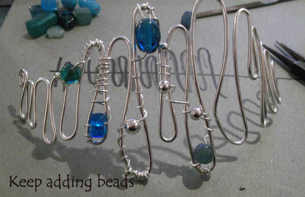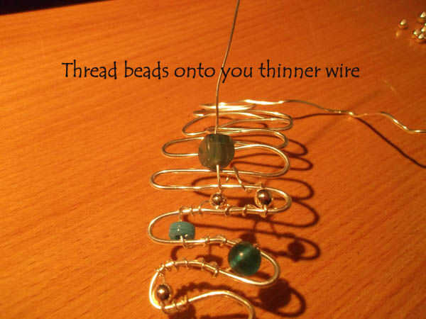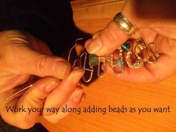 Para comenzar a añadir sus cuentas primero cortan una longitud manejable del alambre más fino, (poss 12" de largo pero que es uso justo no es importante lo que sientes puede administrar) Envuelva el vendaje alrededor del comienzo de la pulsera aproximadamente 1" del final, hacer este bonito y apretado y unas 3 vueltas, luego empezar a añadir tus cuentas, lo que cuentas y colores , tamaño y forma es totalmente hasta usted, envolver el alambre y agregar los granos como le parezca, para fortalecer el cable ocasionalmente de pulsera dos curvas entre sí, cada vez que se ejecuta fuera de alambre acabado que comenzó con un par de vueltas apretadas y luego comenzar de nuevo donde lo dejó.