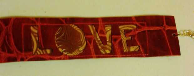 pulsera. Elegir 1 ½ x 6 1/2 y luego cortar dos piezas de cuero (uno sólido y con una textura o imprimir) el mismo tamaño. Fui con la palabra amor y creó una pieza de patrón de papel y que la palabra fue volteada al revés para mostrar a los otros cuando miran la pulsera.