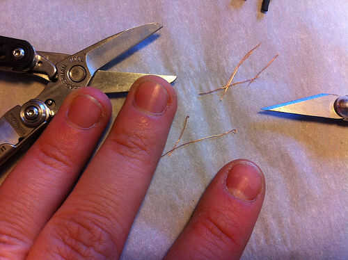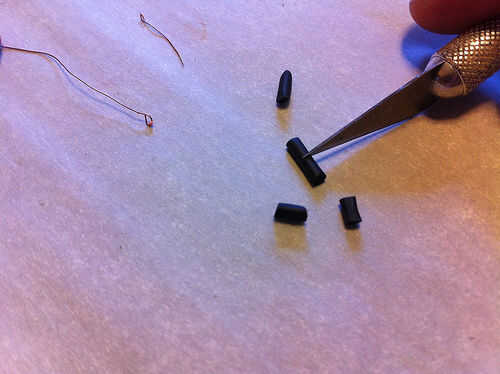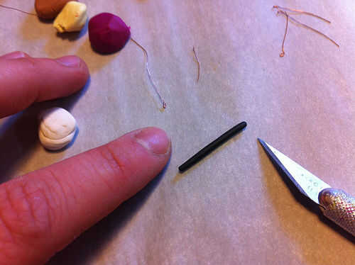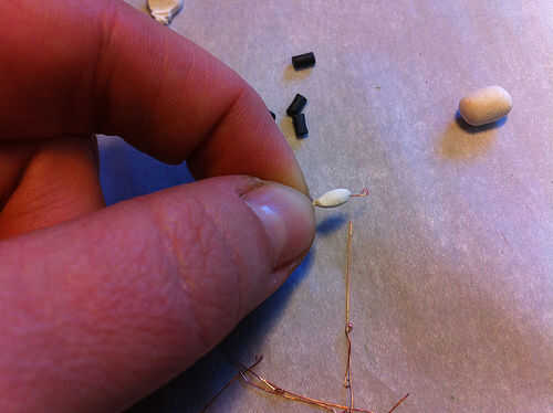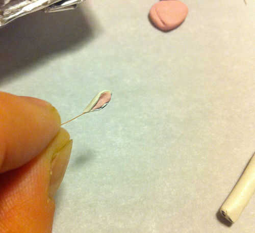 Hacer una forma áspera de piernas, cola y orejas. Cuidadosamente empuje el alambre fino en la cola, y insertar el extremo recto de la punta de la cola, empujando suavemente hasta que salga por el extremo que se adhieren al cuerpo. Tire de la cola a lo largo del cable hasta que el bucle es dentro de la punta de la cola y el larga recto final viene desde el principio de la cola que se adhieren al cuerpo. Lisa la arcilla sobre el bucle expuesta del cable, asegurándose de que quede completamente ajustada.