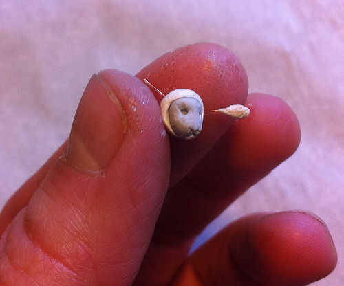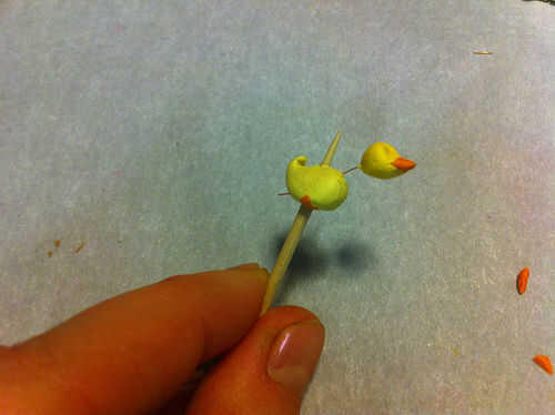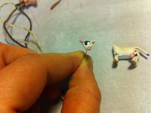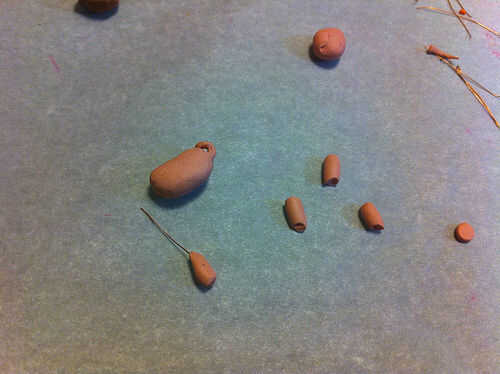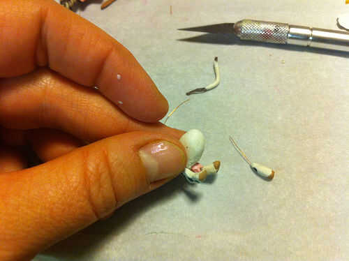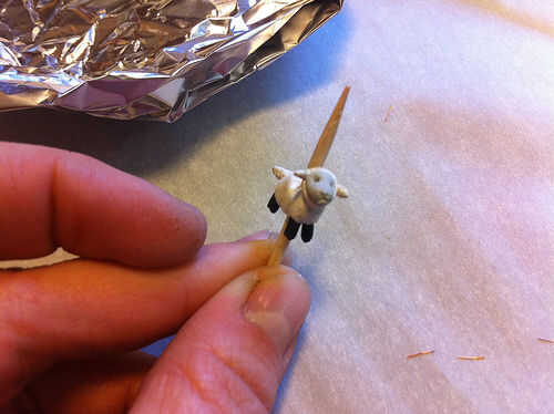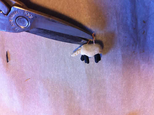 Premade y cocido al horno las ovejas cara y orejas, luego rosca en algunos arcilla blanca para el pelo en la cabeza y había roscado el cabezal sobre el cuerpo con arcilla blanca de la cabeza aún sin hornear. Era más fácil añadir la lana a la cabeza después de que la cara fue cocido al horno así no smoosh, y sabía que la cabeza se fije mejor al cuerpo si algunos arcilla en la cabeza seguía siendo suave y sin hornear.