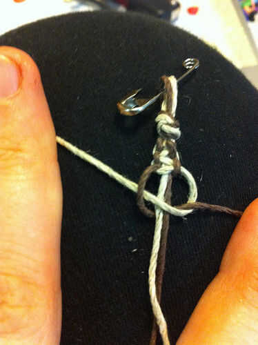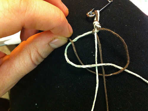 Recoja el cable de color más oscuro de la izquierda, asegurándose de que está mintiendo con el cable de color más ligero. Ahora colóquelo debajo de los dos cables mediados corto, luego tire de ella a través del lazo de cuerda color luz a la derecha (Foto 3).