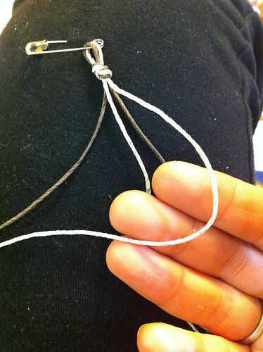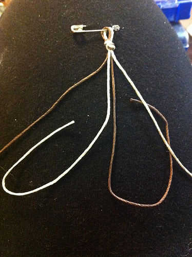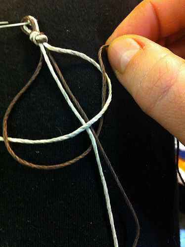 Asumiendo que estás haciendo el tejido plano, recoja el cable de luz de la izquierda (aún imagen 5), deja un bucle de exceso de la cuerda de la izquierda y pone sobre las dos cuerdas cortas medianas. Colocar en el cable de color más oscuro a la derecha.
